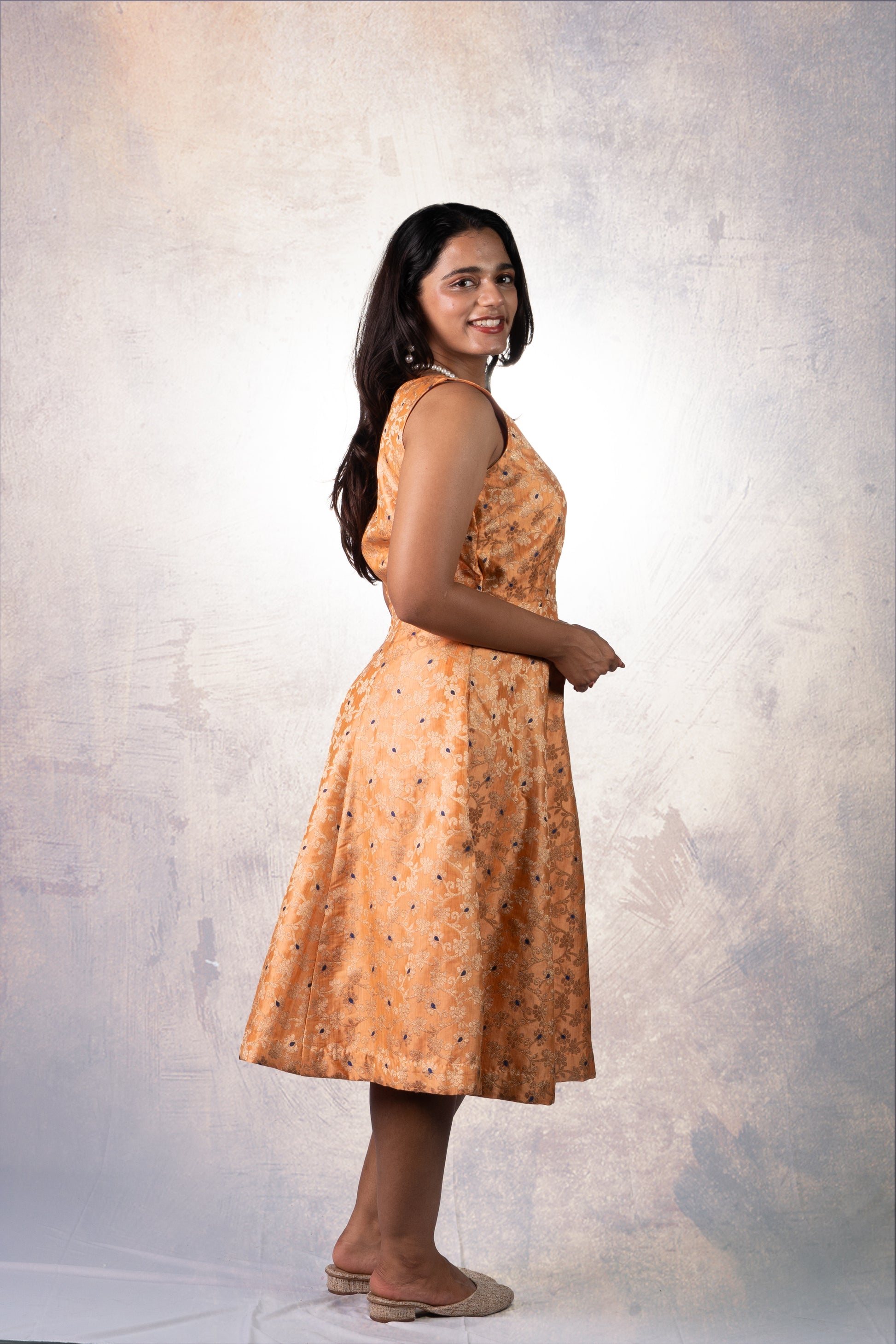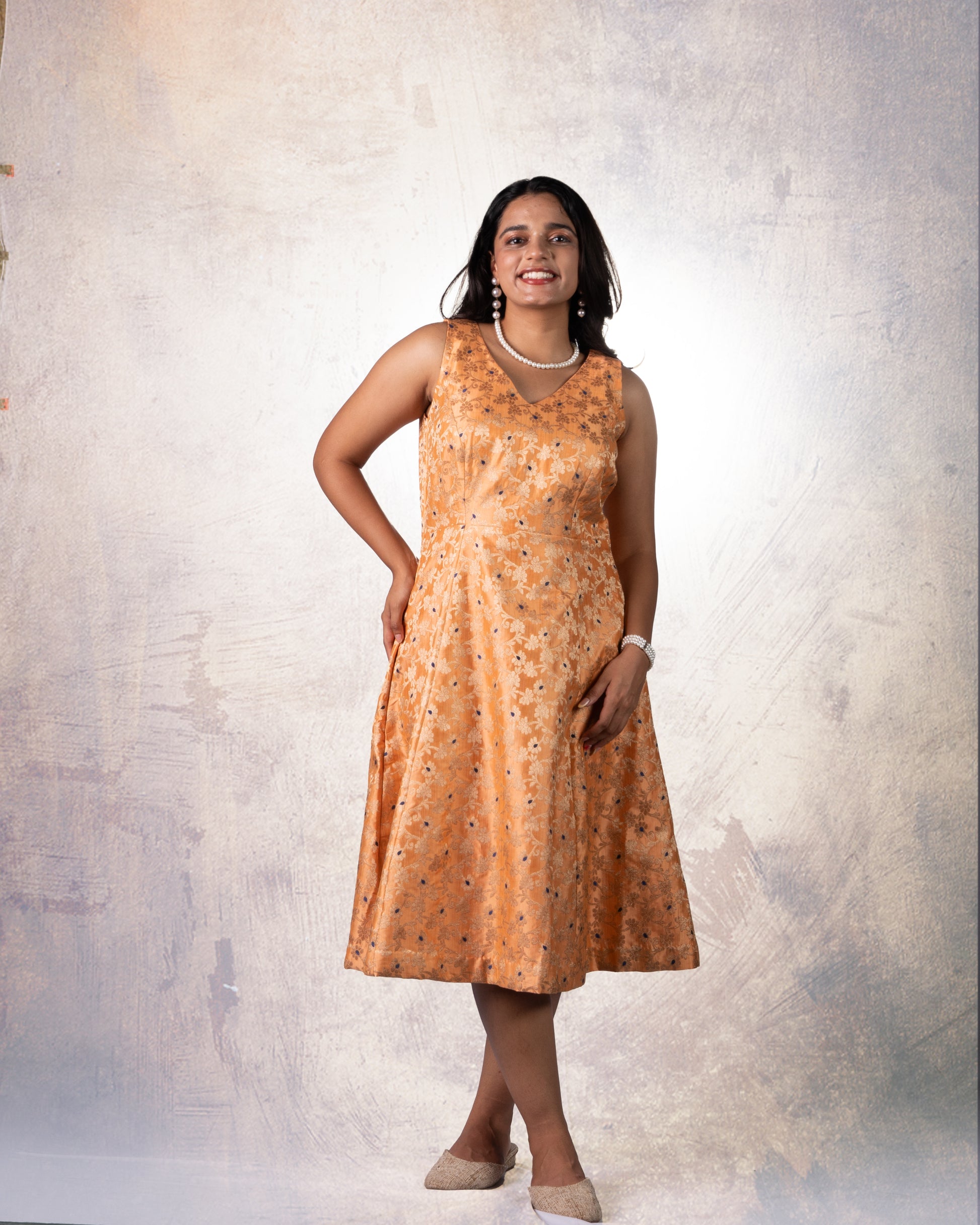 A luminous golden-orange midi dress, cut in a fluid silhouette with a deep V-neckline and effortless flare. Finished with concealed pockets, it balances opulence with quiet functionality.