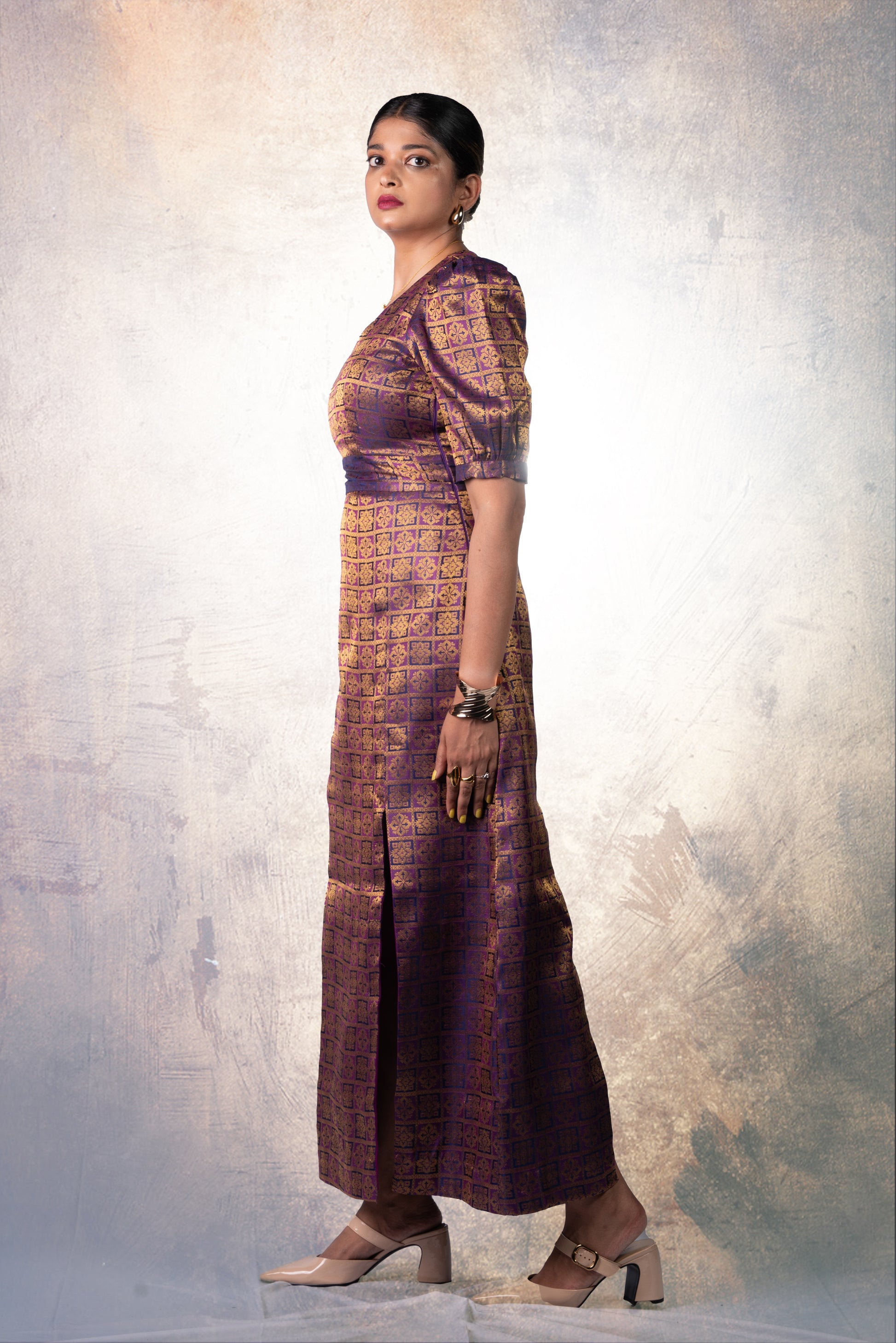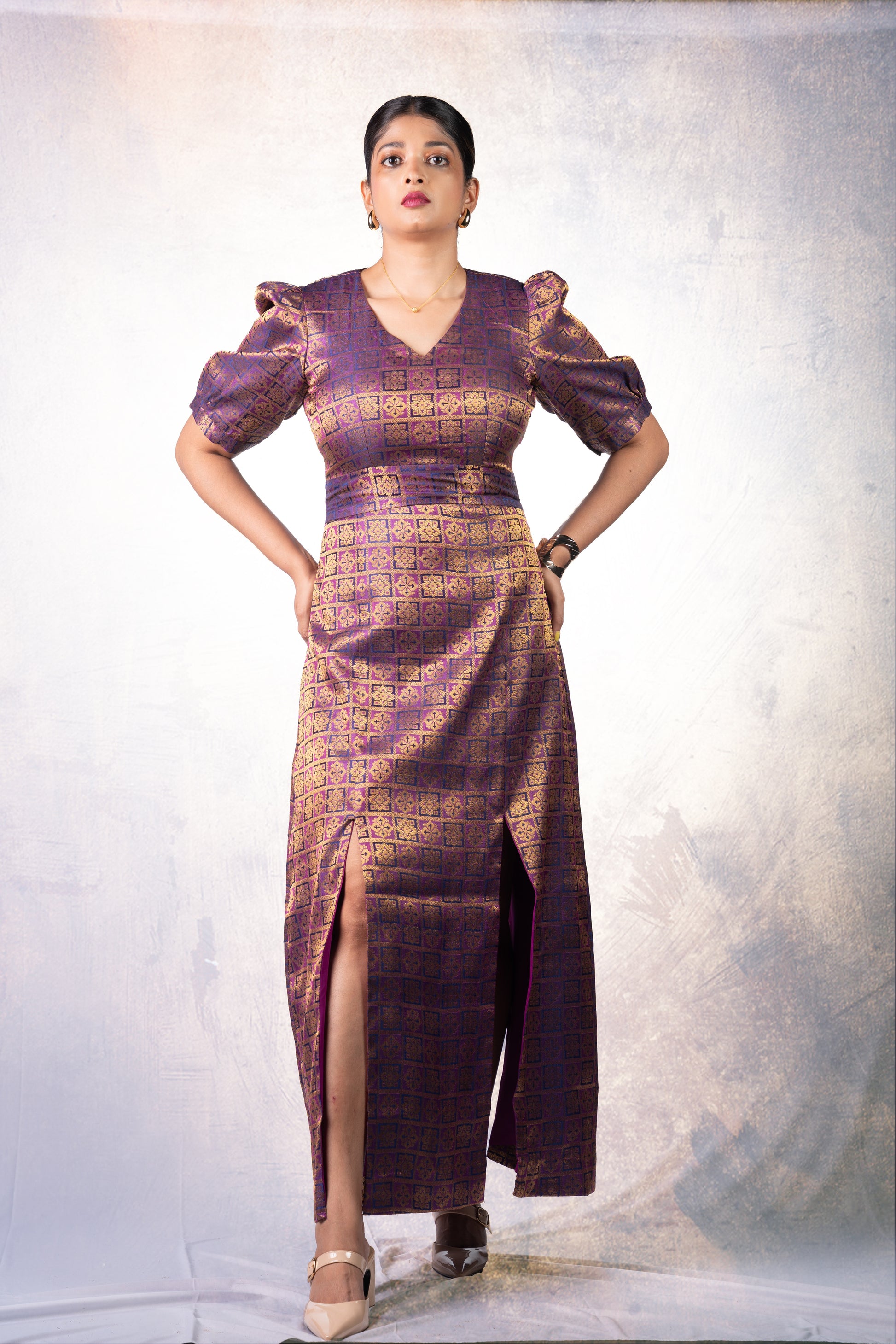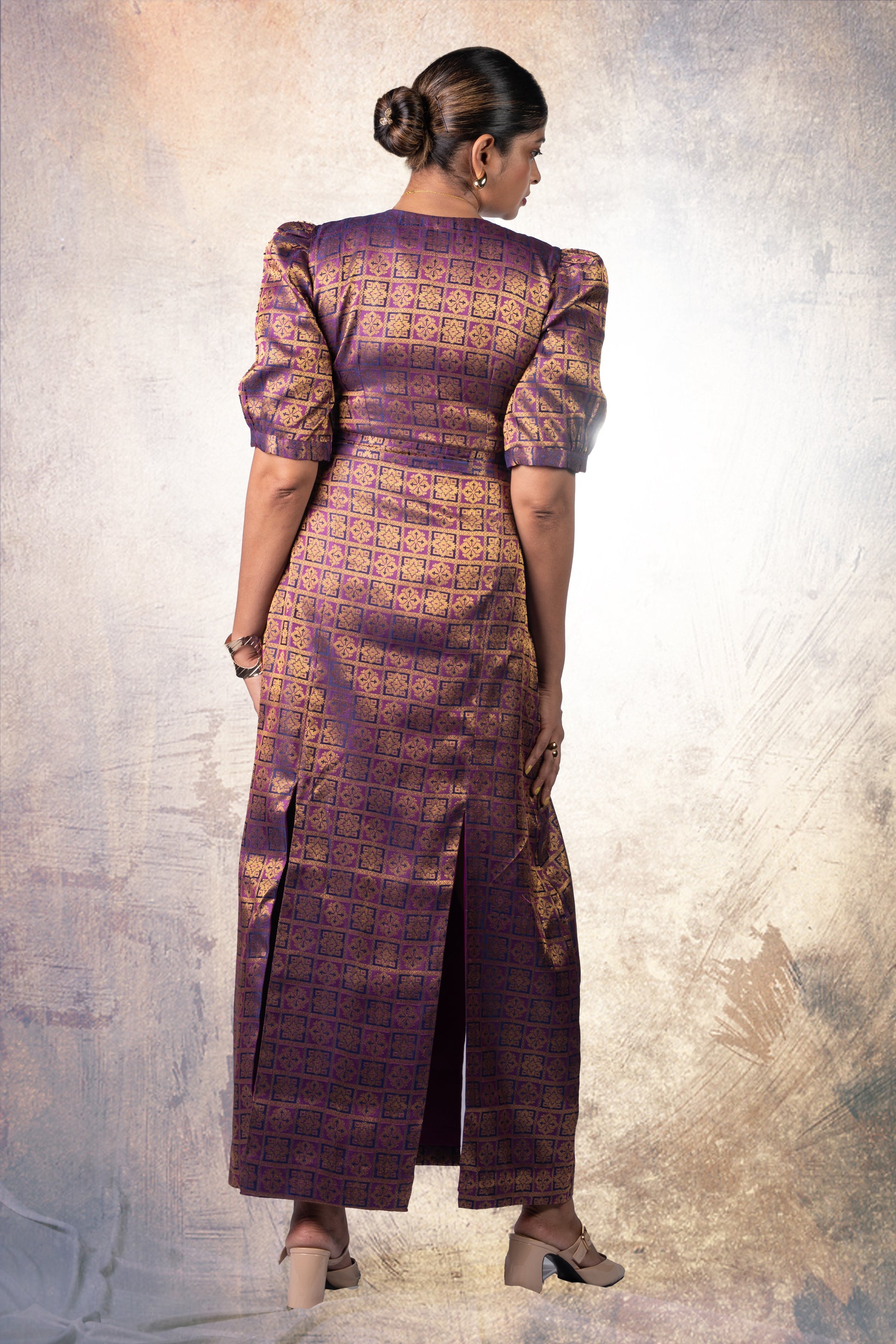 A regal purple and gold brocade maxi dress with a fitted bodice, dramatic puff sleeves, and a flattering V-neckline. Designed with two front and two back slits for ease and movement, finished with a concealed side zip for a seamless fit and a smooth lining for comfort.
