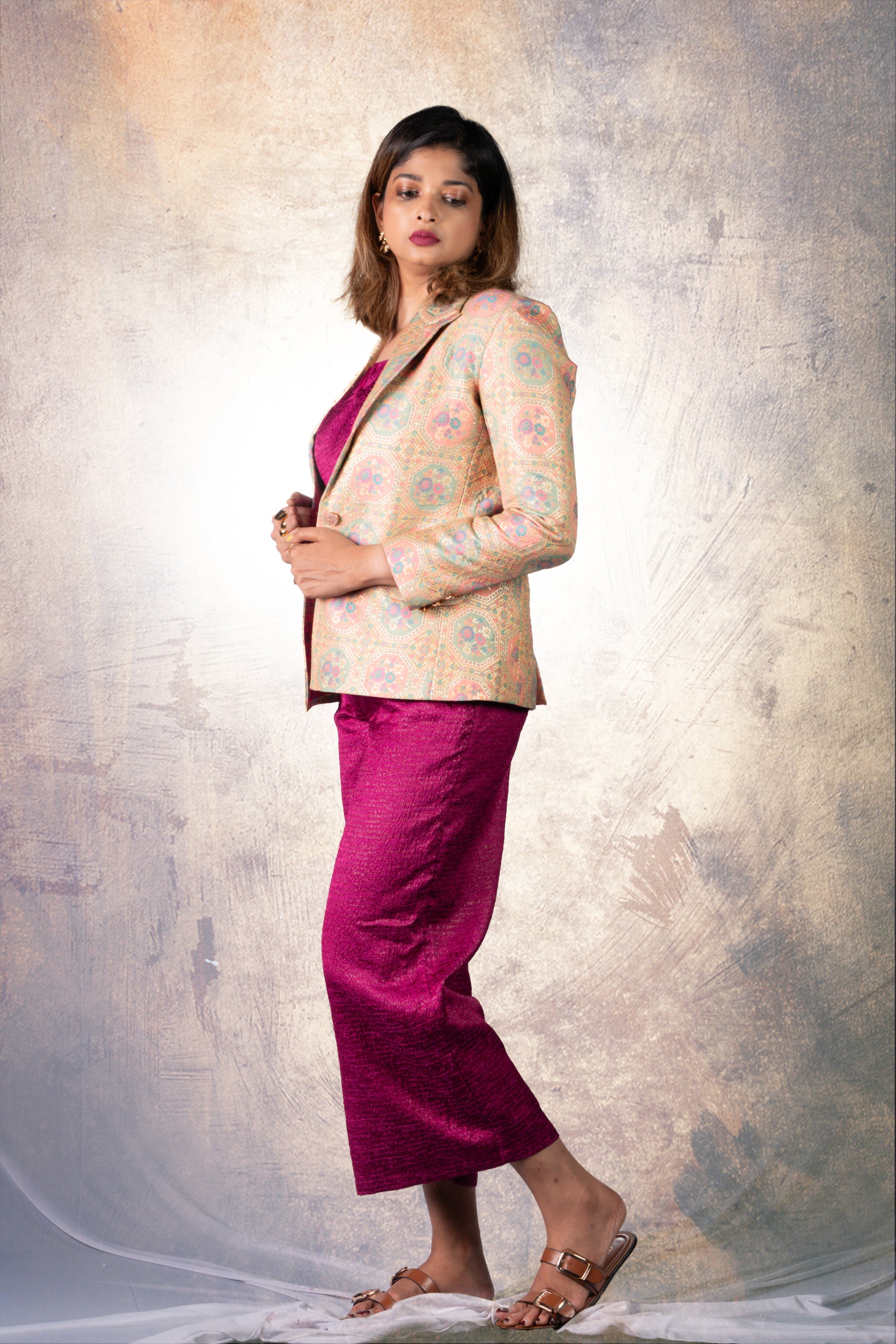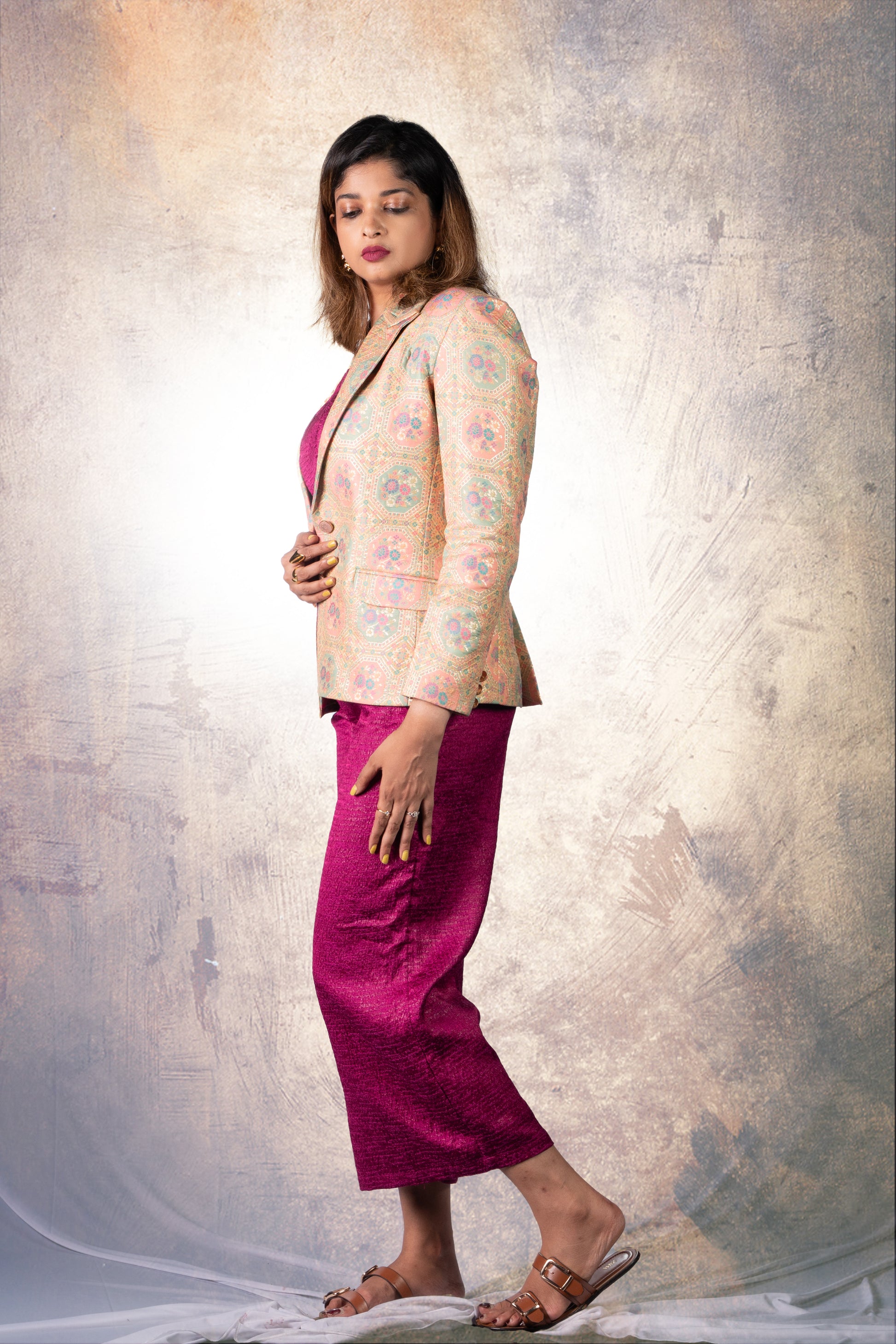 A sculpted ivory blazer in rich brocade, where classic tailoring meets artisanal grandeur. Its subtle sheen and intricate weave elevate structure into quiet luxury.