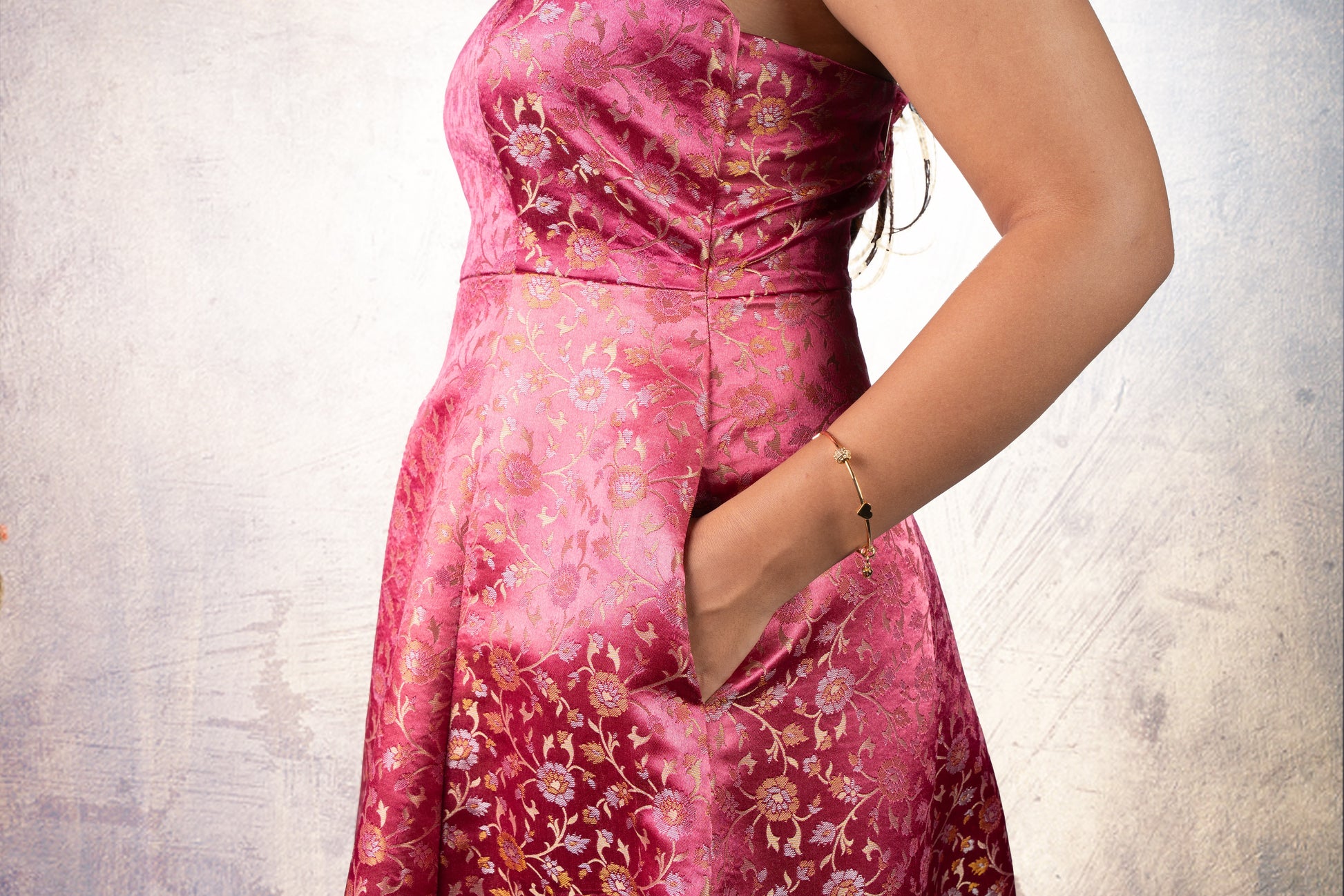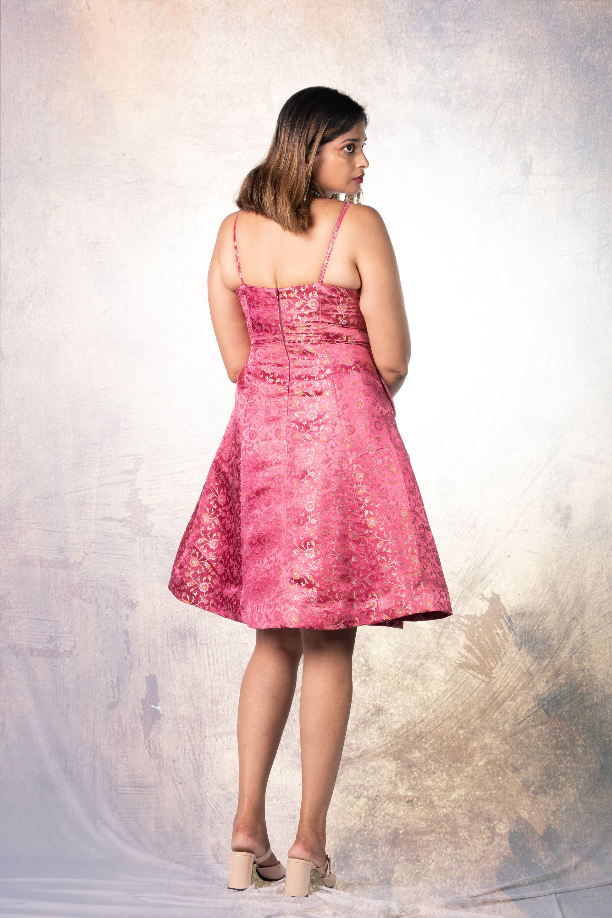 Playful silk brocade skater dress in rich pink with floral zari motifs. Designed with a fitted bodice, delicate straps, and a flared skirt that moves with ease. Features side pockets, a concealed back zip for a seamless finish, and full lining for comfort.